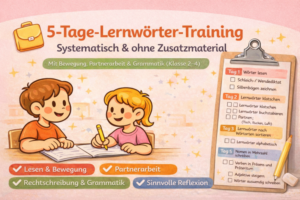 Lernwörter üben gehört in der Grundschule zum Alltag.Aber ganz ehrlich? „Schreib jedes Wort fünfmal“führt selten zu echter Rechtschreibsicher...