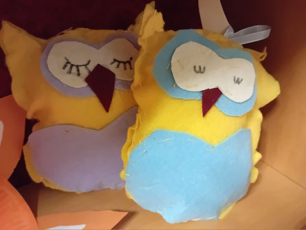 In zwei Doppelstunden haben wir kleine Eulen aus Filz genäht. Auf der Vorderseite wurden die Teile für Bauch und Augen aufgenäht (vorhe...