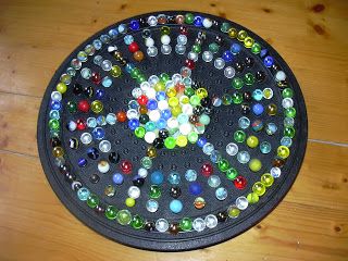 Die schwarze Scheibe, auf der meine Kinder die Murmeln so sorgsam drapiert haben, ist eigentlich eine Balancescheibe, die man für Fußgymnastikübung...