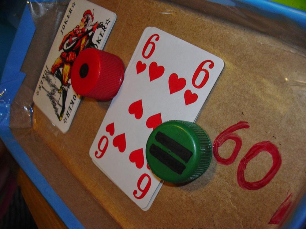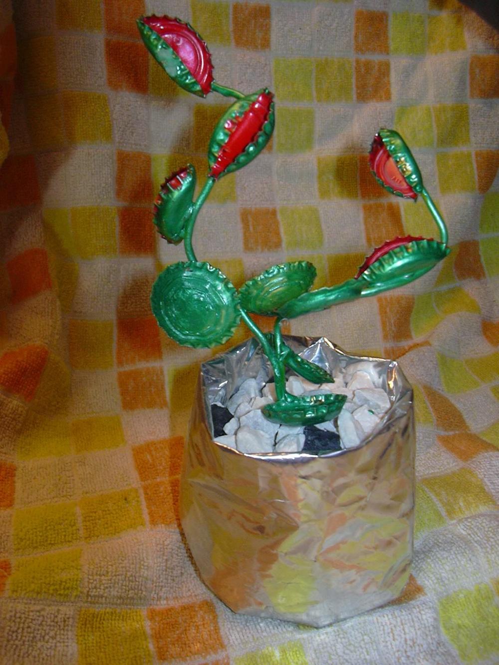 Die Kronkorken werden mit Zangen bearbeitet, die einen abflachen, die anderen in der Mitte knicken. Anschließend mit Acrylfarben bemalen und mit HeiÃ...