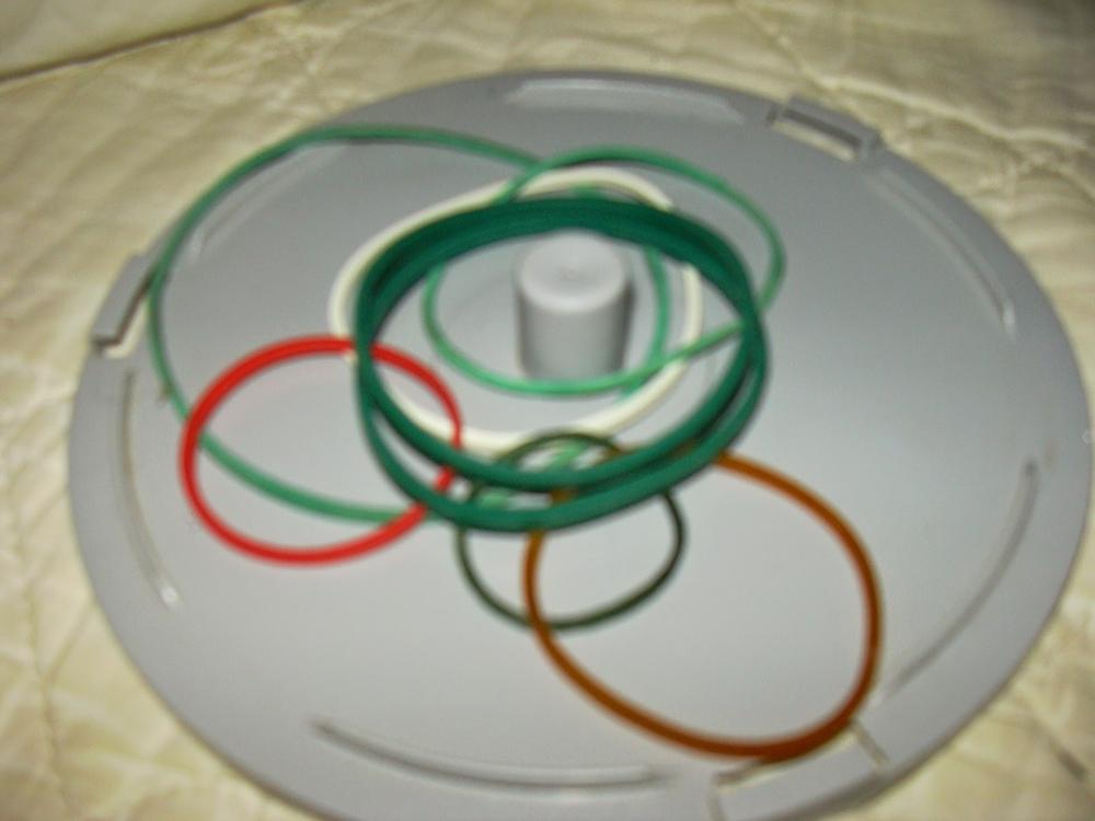 Eine wirklich einfache Idee, die die Feinmotorik schult, Spass macht, wenig Platz braucht, bestehend aus einer alten CD Spindel und bunten Gummiringen...