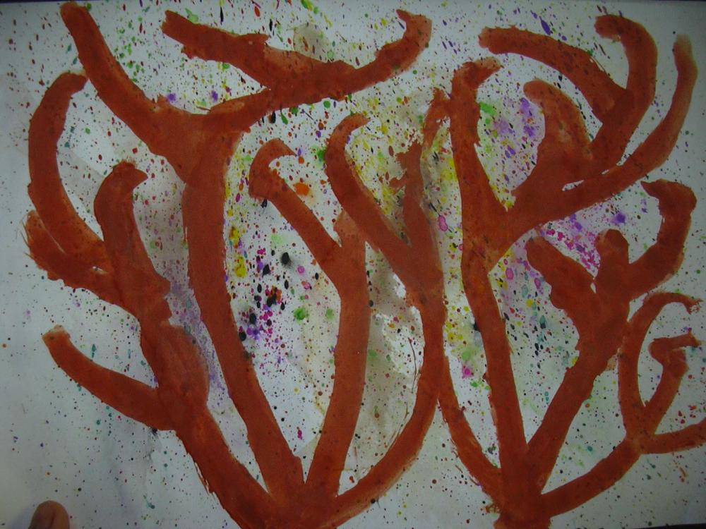 Zuerst mit Wasserfarbe und Pinsel bunte Spritzer und Kleckse machen. Am besten ging es, als wir mit dem Pinsel auf einen zweiten klopften, anschließe...
