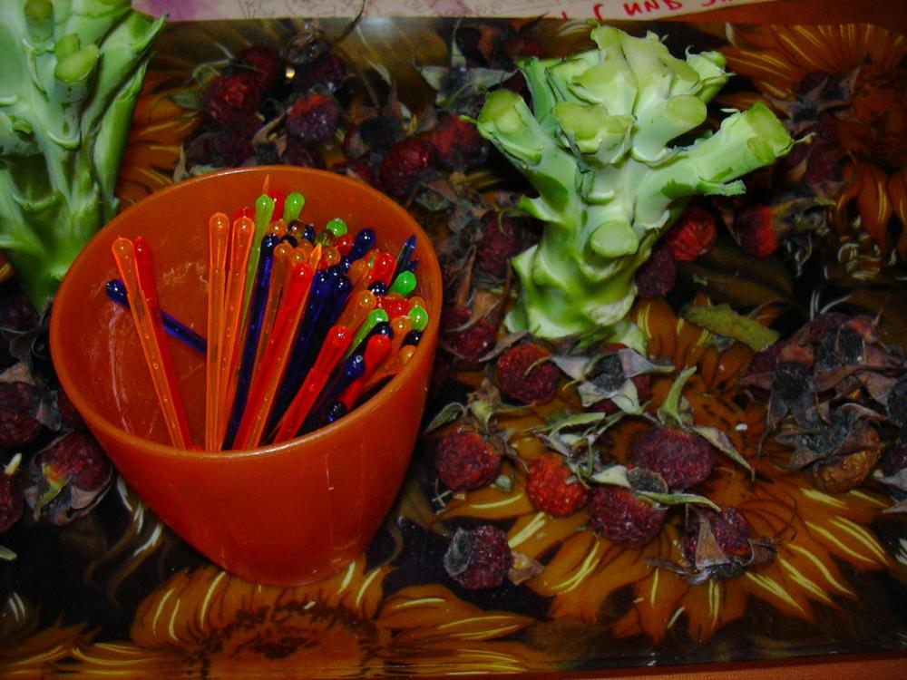 Wieder eine witzige Idee für alle Jahreszeiten mit Gemüseabfall! Diesmal haben die Kleinen mit bunten Partyspießen und Krepppapier Nähen geübt.&n...