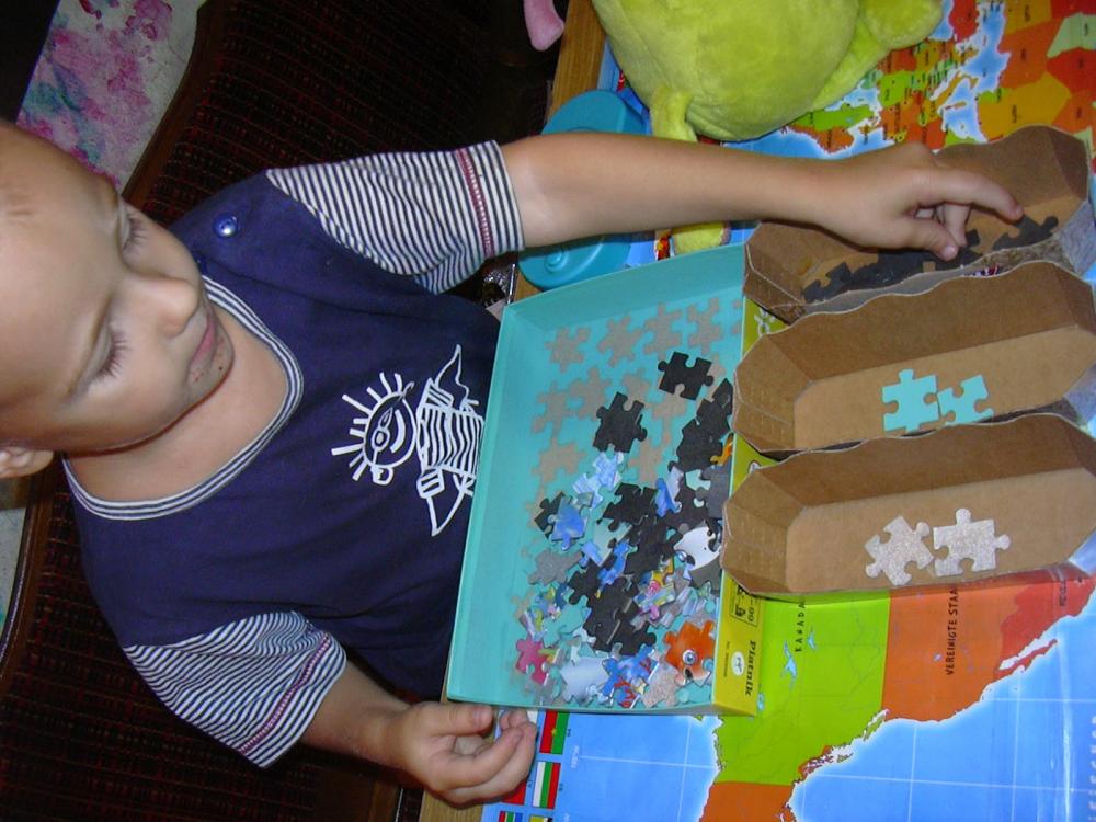 Alte Puzzles, von denen Teile fehlen wurden gesammelt und verschieden lackiert. Wer denkt, dass er nur sortiert,der irrt!Er zählt und spielt rec...