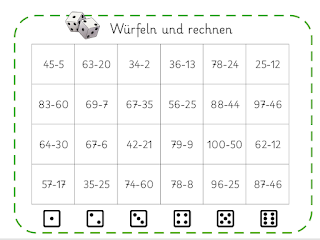 Hallo ihr Lieben,zum Üben der Subtraktion bis 100 habe ich heute neues Übungsmaterial erstellt. Für diese Übung benötigt man zusätzlich Würfel ...